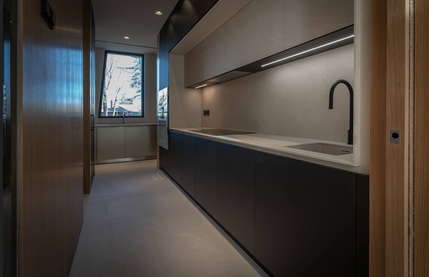 La cocina principal se organiza en una única línea de mobiliario bajo y superior. Los frentes están realizados en LUXURY STONE, un acabado de gran riqueza visual, con un tono oscuro que aporta profundidad sin sobrecargar. Los muebles altos, en un tono más claro y liso, generan contraste y ligereza.