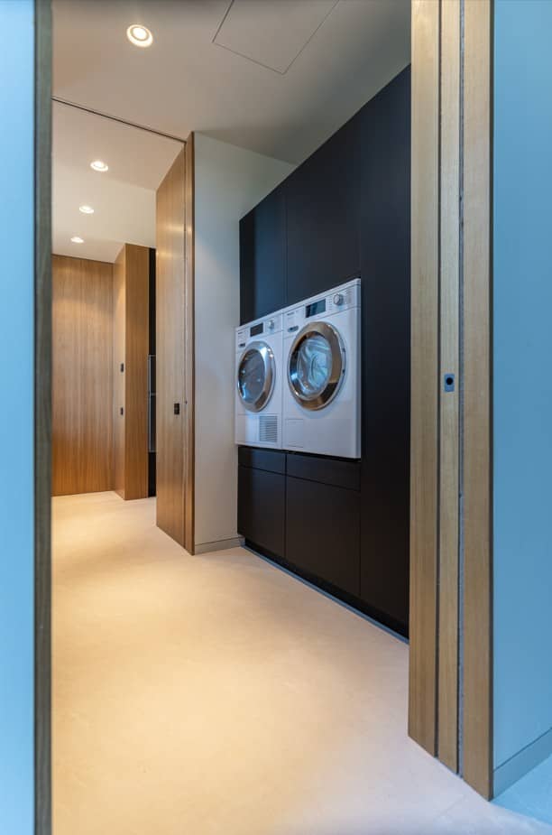 En el espacio auxiliar destinado al lavadero, se ha mantenido el mismo lenguaje formal: frentes oscuros, superficies limpias, continuidad estética. Aquí se integran lavadora y secadora, armarios de almacenamiento y una zona de apoyo. Separar este uso de la cocina no solo aporta orden, sino que mejora la experiencia del usuario y mantiene el corazón de la casa despejado para cocinar, recibir o disfrutar.