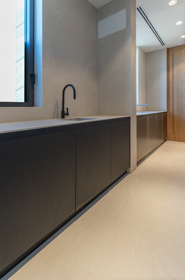 Ambos espacios comparten el uso del modelo LUXURY STONE, protagonista absoluto del proyecto por su textura sobria, su color profundo y su gran resistencia.