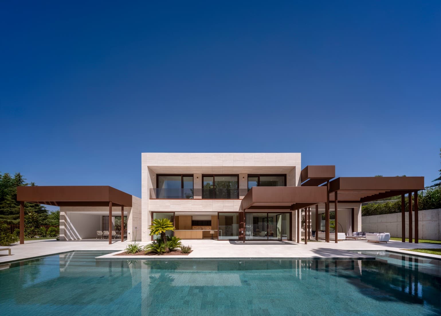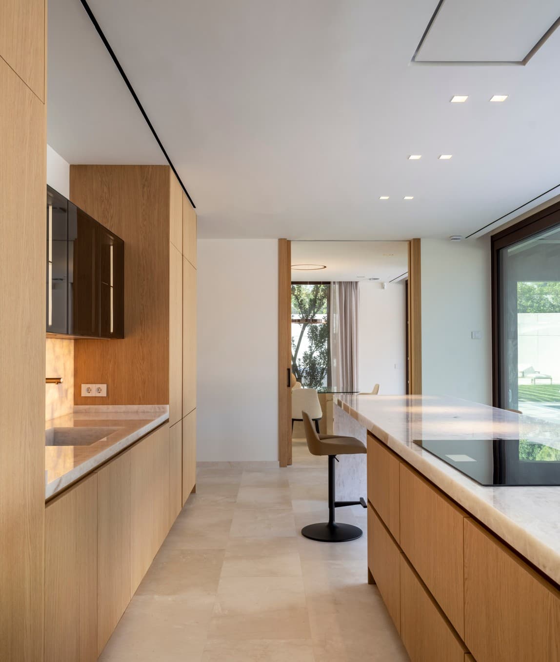 Uno de los mayores retos de la arquitectura de cocinas de lujo contemporánea es la integración con las áreas de ocio exteriores. En este proyecto, la cocina se sitúa estratégicamente frente a los grandes ventanales correderos que dan a la piscina.