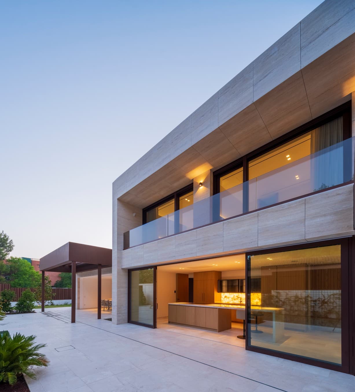 Iluminación integrada: La luz se utiliza de forma técnica para resaltar el plano de trabajo y la textura de la piedra, creando una atmósfera acogedora durante la noche que se integra con la iluminación ambiental del jardín.