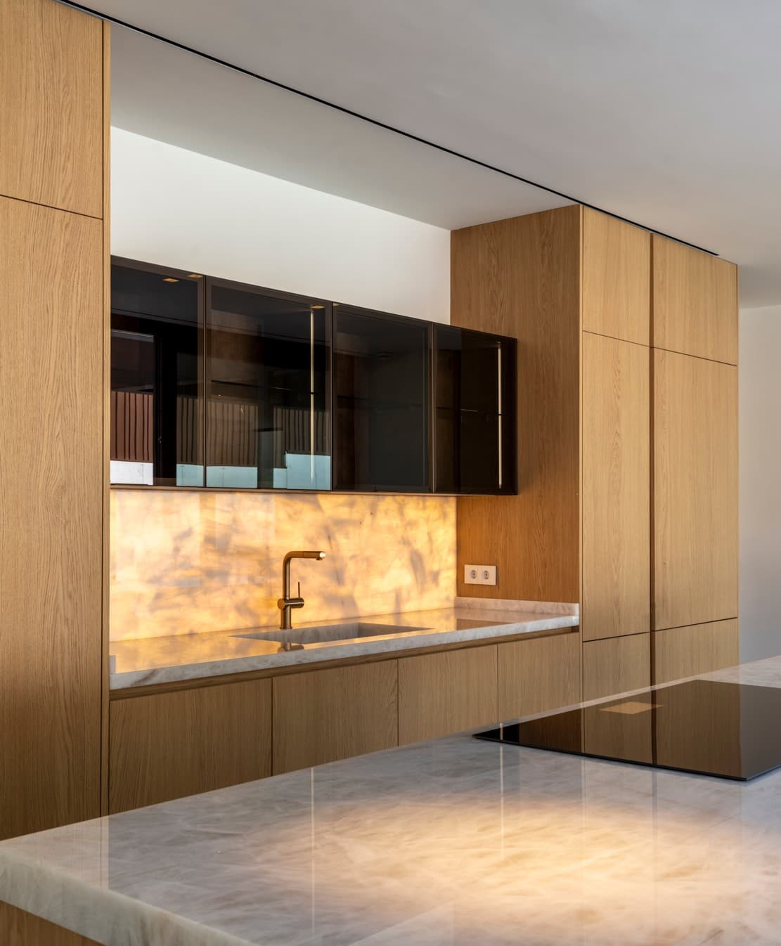 Ebanistería técnica en roble: Los frentes de madera, con una veta vertical perfectamente alineada, aportan la calidez necesaria para contrarrestar la frialdad de los grandes paramentos acristalados.